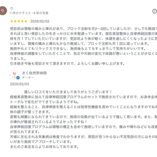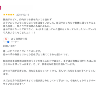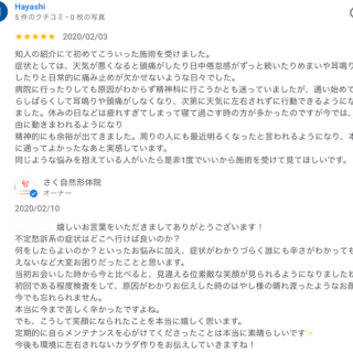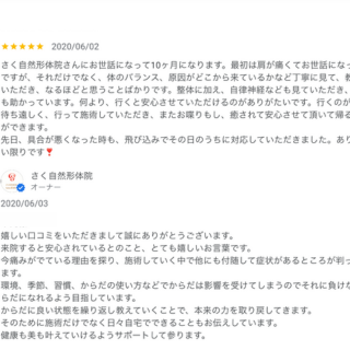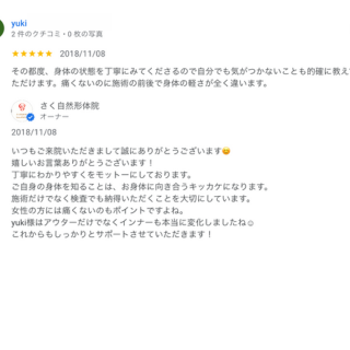 さく自然形体院さんのお世話になって10ヶ月になります。最初は肩が痛くてお世話になったのですが、それだけでなく、体のバランス、原因がどこから来ているかなど丁寧に見て、教えていただき、...