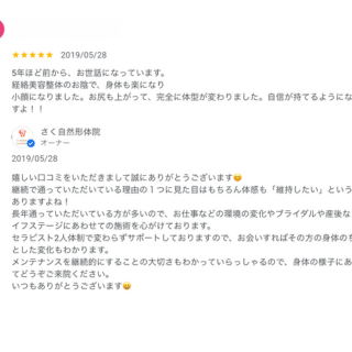 5年ほど前から、お世話になっています。 経絡美容整体のお陰で、身体も楽になり、小顔になりました。お尻も上がって、完全に体型が変わりました。自信が持てるようになりました。 【さく自然...